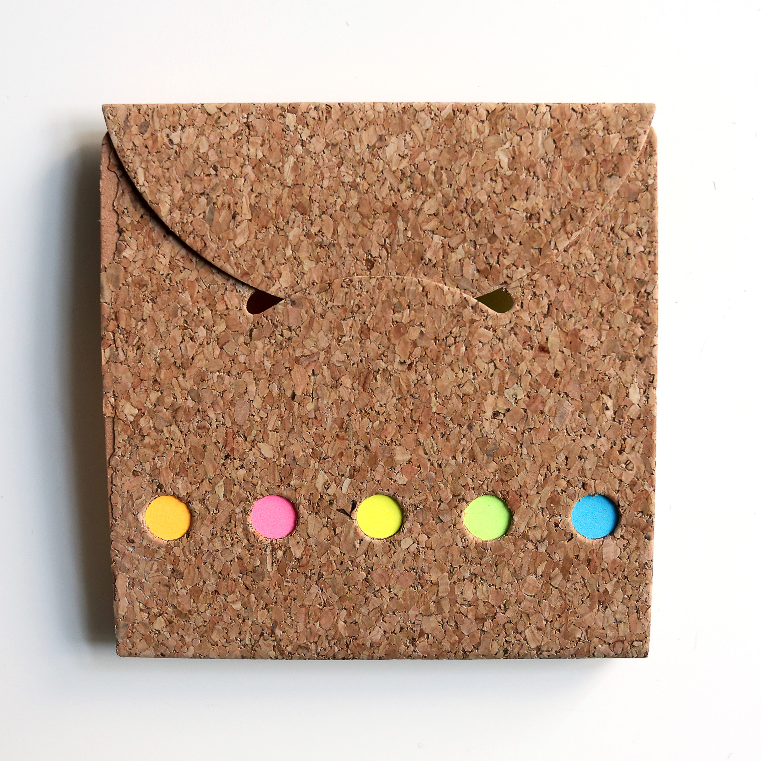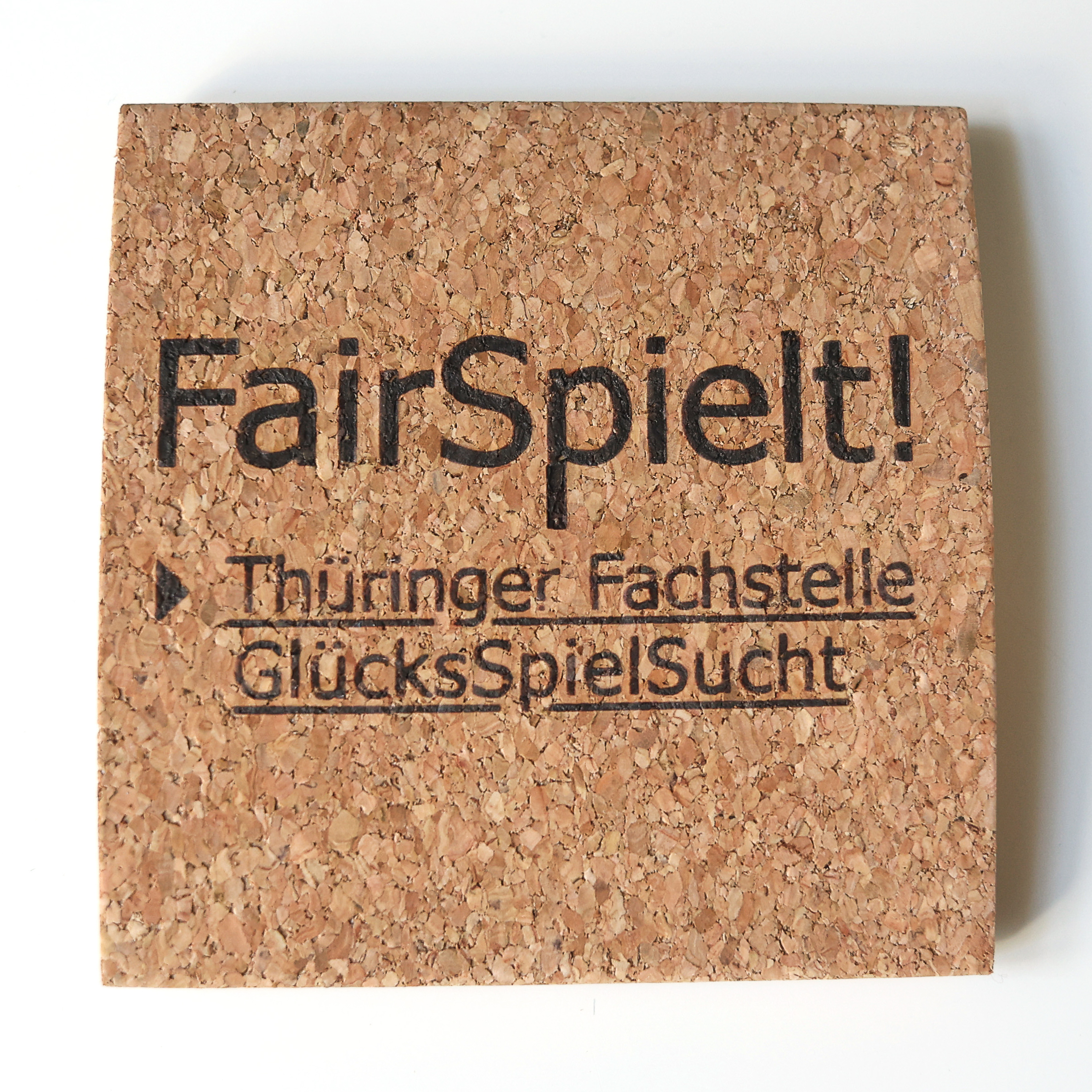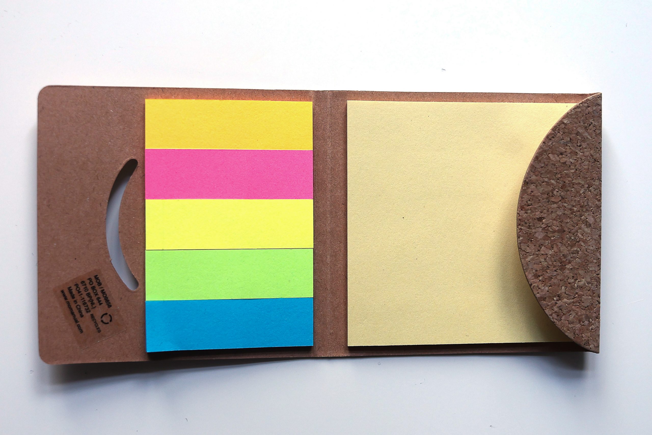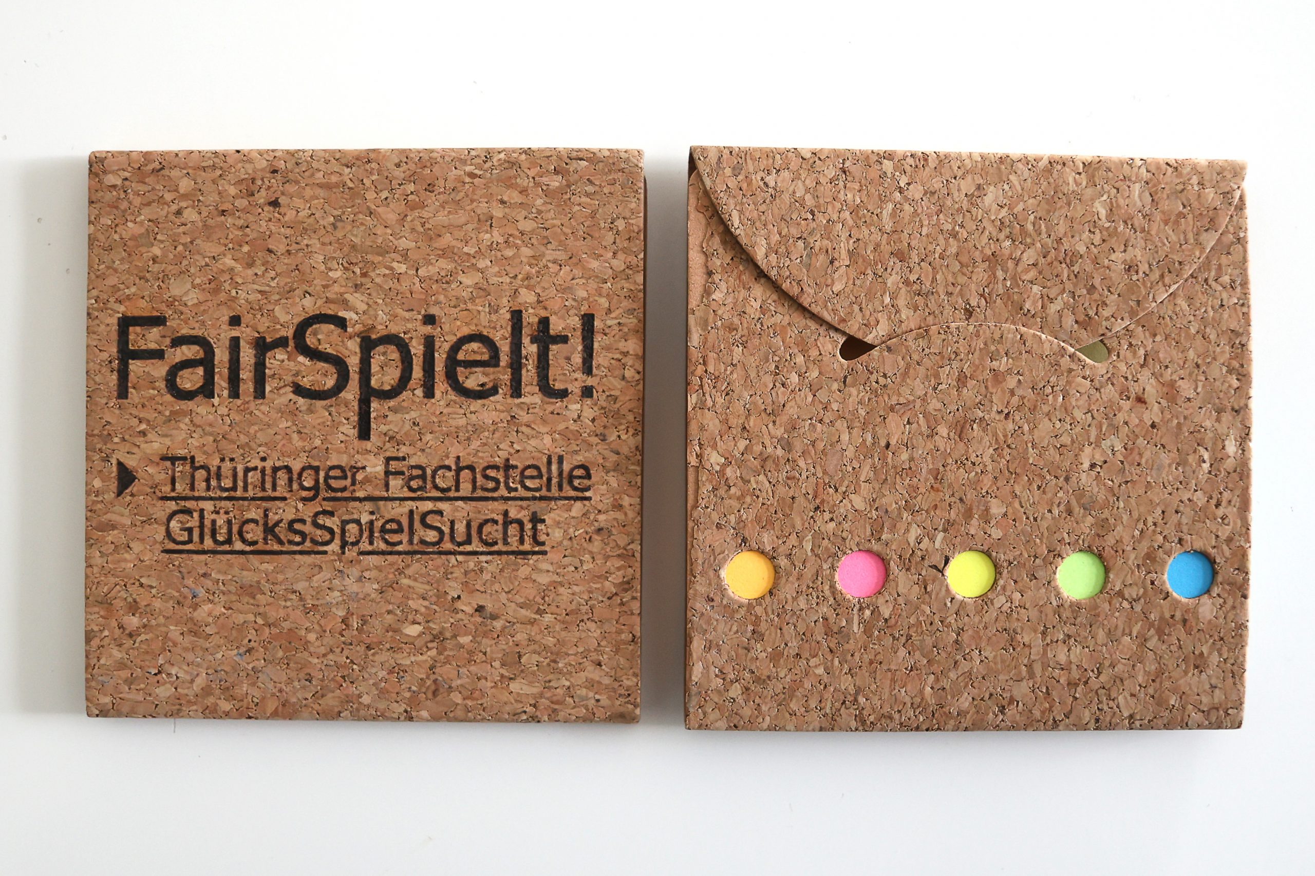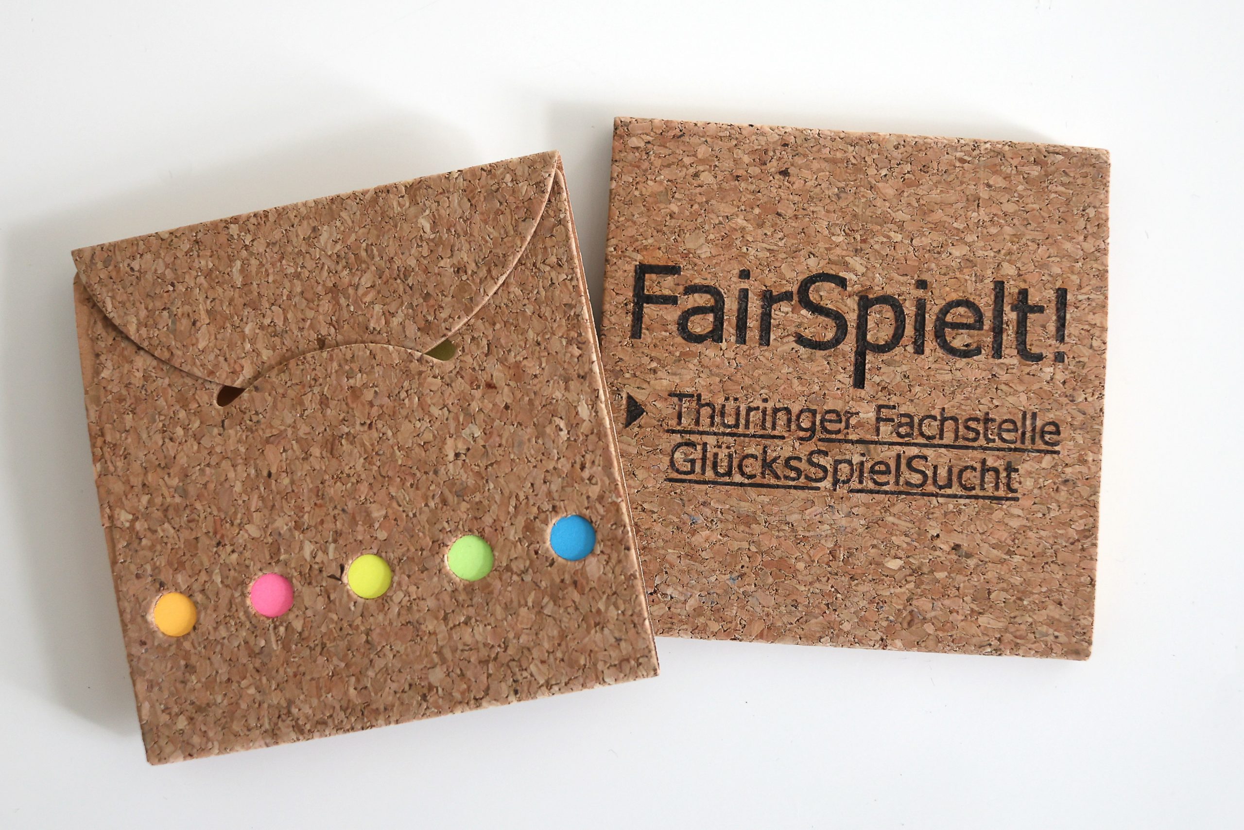Faltbares Post-It Set aus Kork mit „FairSpielt!“ Logo